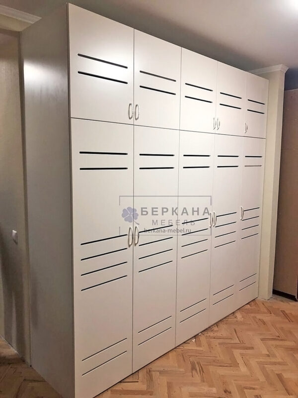 В проекте изготовили шкаф с распашными дверьми. Привлекает необычное внешнее оформление дверей. На фасадах – сквозная фрезеровка. Благодаря фрезеровке, воздух свободно циркулирует внутри шкафа. Такое решение – своеобразный аналог дверям с жалюзи.