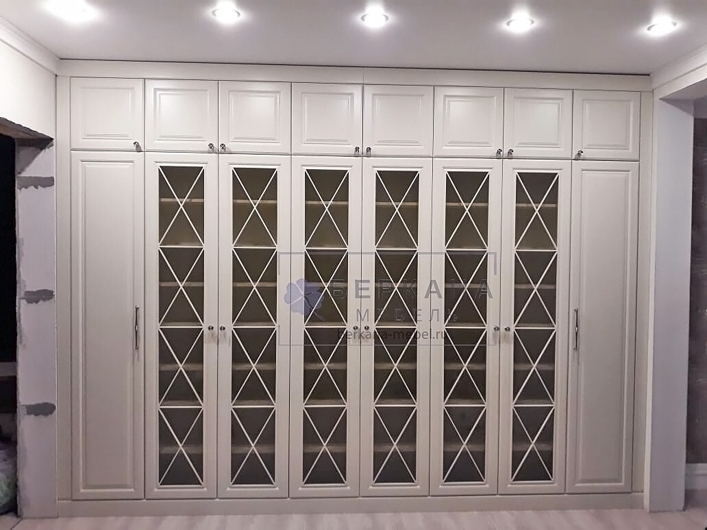 В заказе изготовили и установили библиотеку в стиле Классика. Особенность проекта – эксклюзивные фасады с перекрестиями. Фасады разрабатывались исключительно для клиента. Вставки в двери – прозрачное стекло.