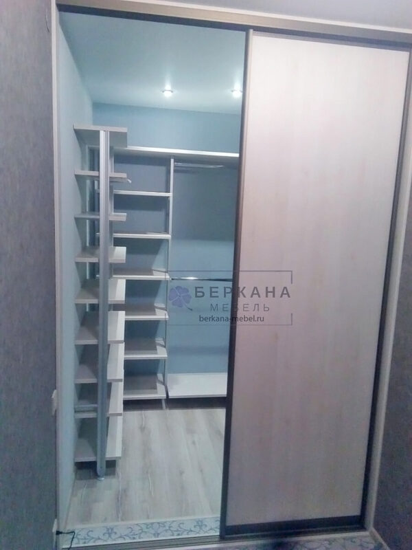 Закрывают гардеробную раздвижные двери с верхней и нижней направляющей. Вставки в двери – ЛДСП в цвет полок гардеробной.