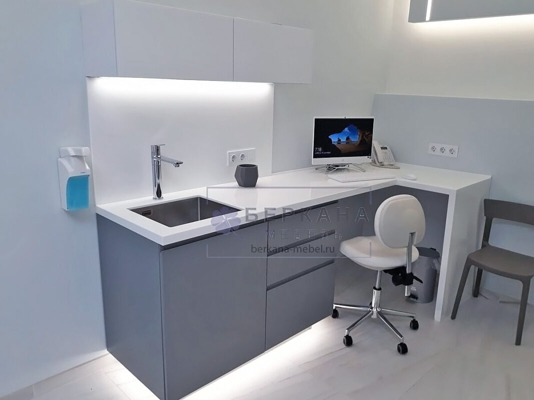 При комплексном обустройстве клиники соблюдали единый дизайн и цветовое решение. Рабочие места отличаются конфигурацией: линейное и Г-образное. Столешница из искусственного камня переходит справа в опору стола.