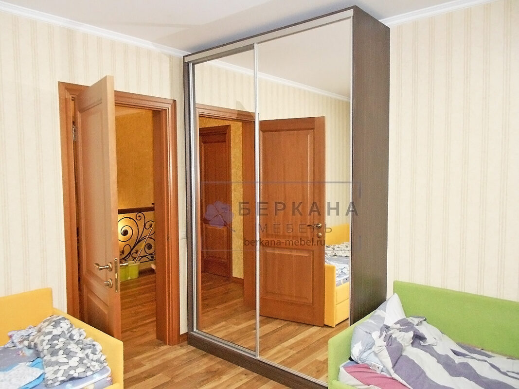 Шкаф-купе из двух одинаковых секций. Для одежды на вешалках – выдвижная штанга. Благодаря сочетанию светлой и темной ЛДСП с текстурой дерева, изделия смотрятся оригинально, легко и солнечно.