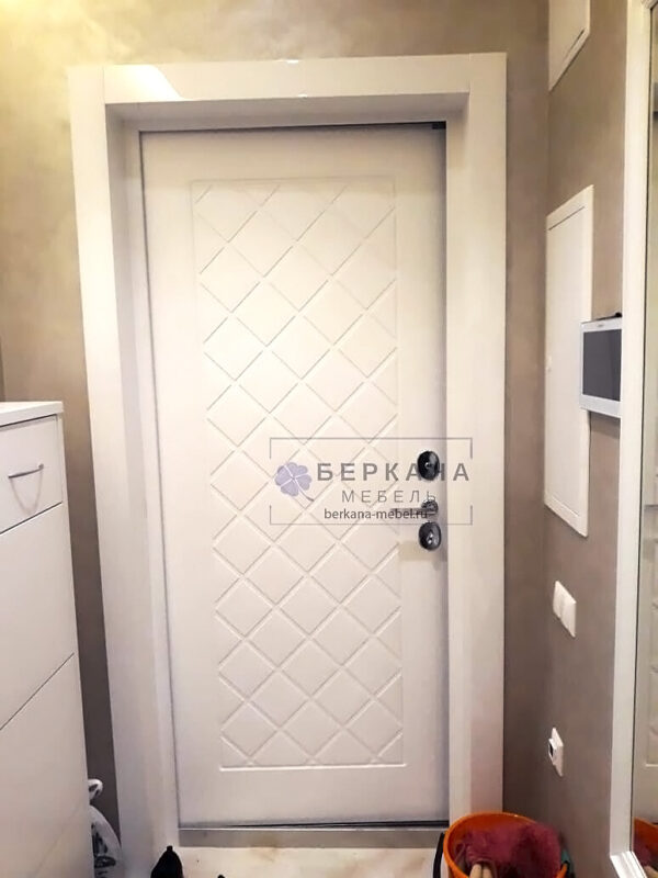 Так, в проекте установили обрамление входной двери и проема, соединяющего балкон и комнату. Наличники и коробка – из МДФ в глянцевой эмали. Глянец смотрится дорого и презентабельно.