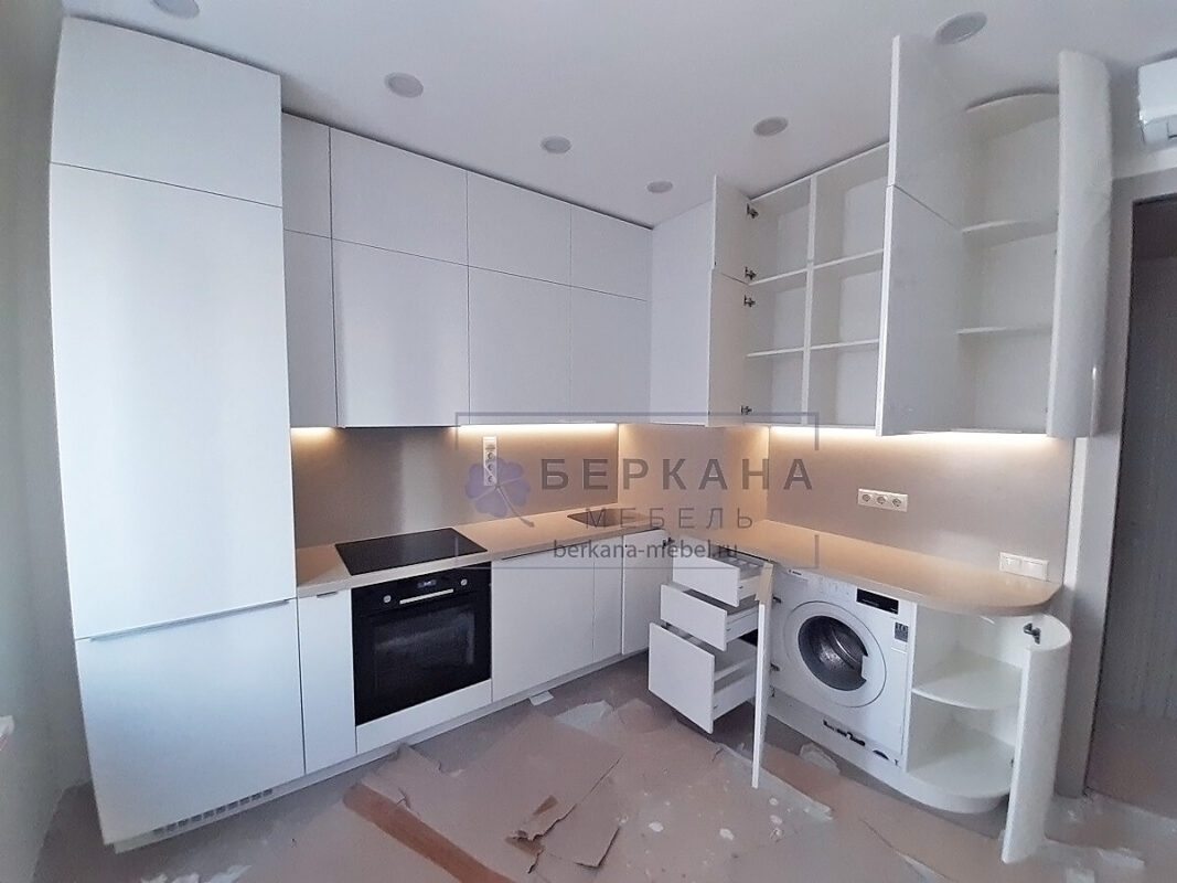Кухня — это, пожалуй, одно из самых сложных для обустройства помещений. Здесь нужно и удобно расположить технику, раковину, рабочее пространство должно быть достаточным для готовки. При проектированного представленного кухонного гарнитура учли эти моменты. Корпус моделей выполнен из ЛДСП компании Egger. Фасады — из в эмали. Радиус завершающих гарнитур шкафов справа изготовлен по индивидуальному заказу. Фурнитура австрийской компании Blum.Кухня максимально полезно занимает отведенное пространство. Нашлось место и для такого полезного элемента, как бутылочница.
