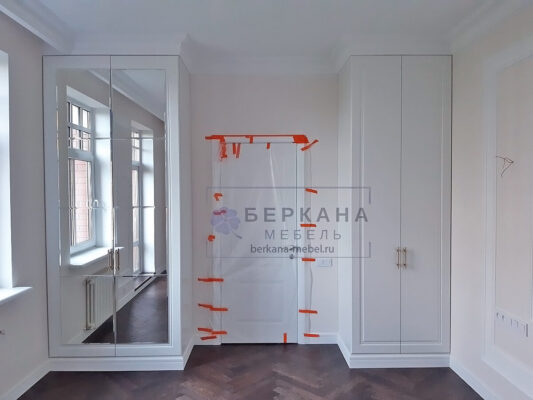 В представленном проекте три предмета мебели: рабочий стол, комод под телевизор, шкаф для одежды. Интересная находка в проекте – горизонтальная фрезеровка на фасадах из МДФ под эмалью.