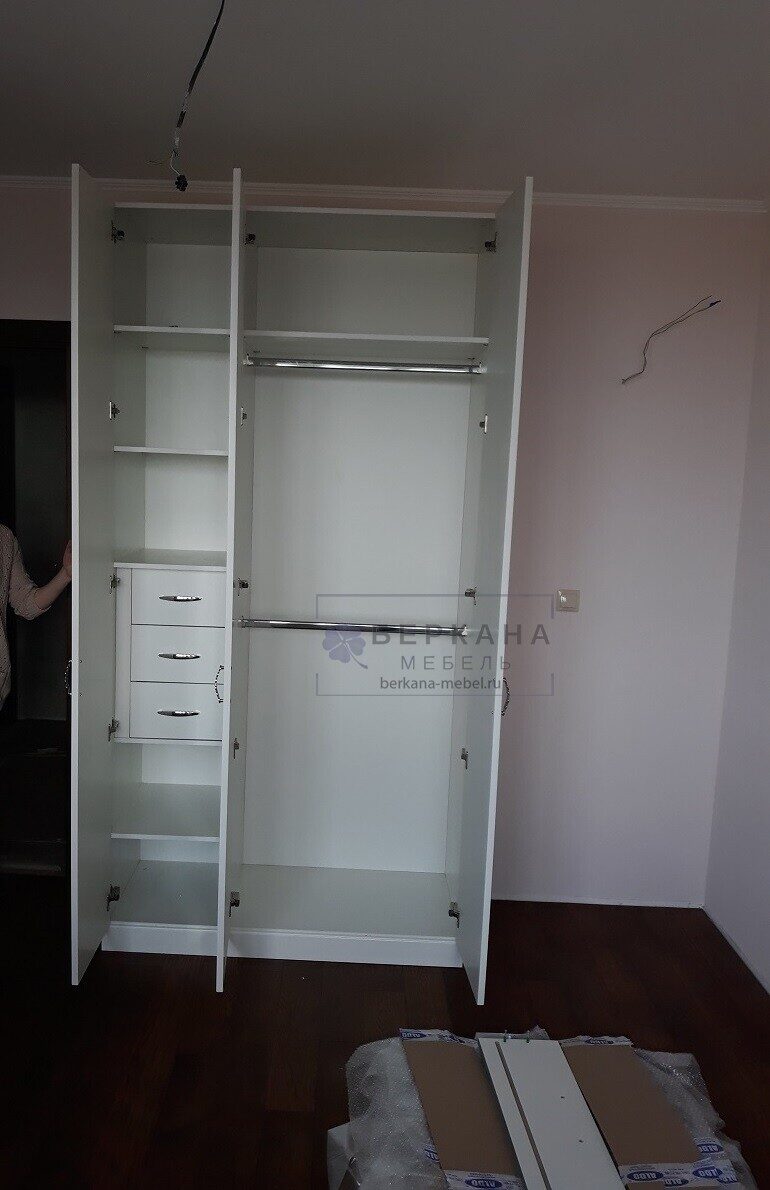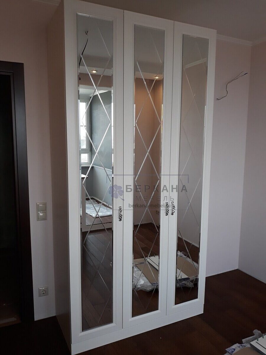 Шкаф для одежды с распашными дверьми включает необходимые элементы для размещения вещей: трубки, полки, выдвижные ящики. Вставки в двери из зеркала серебро с классической гравировкой «ромбы».