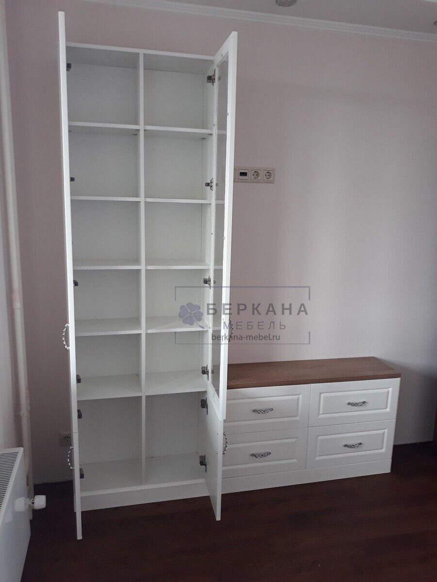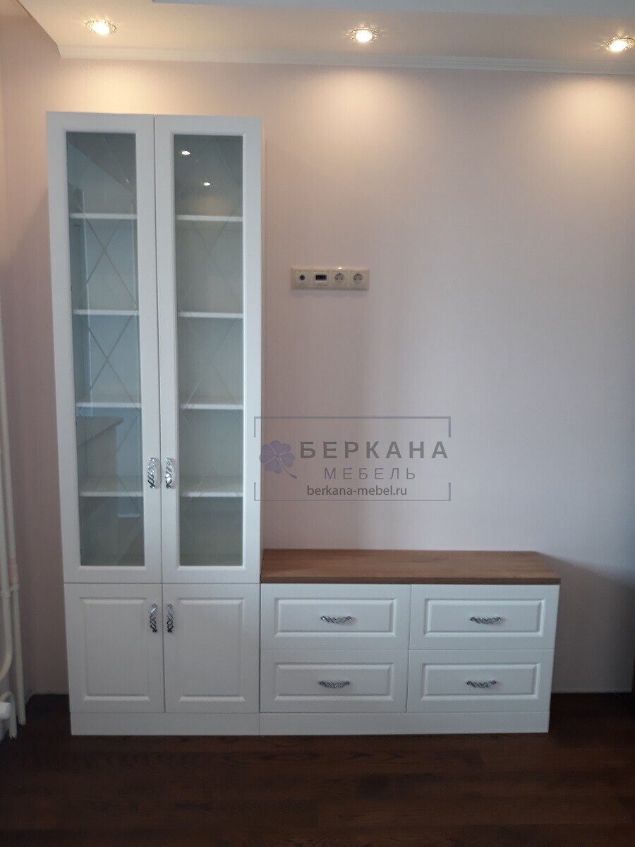 Индивидуальный проект в стиле Классика в белом цвете. Классический стиль изделий разбавляется использование ЛСДП с текстурой дерева на столешницах и крышке тумбы под телевизор. Наши возможности и разнообразие материалов помогают реализовать любой замысел.