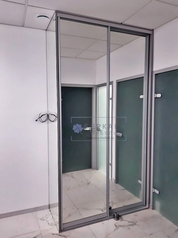 Так, в представленном проекте разработали шкаф для одежды с раздвижными дверьми. Шкаф привлекает внимание необычным внешним оформлением, которое создает эффект невидимки – это зеркальная правая боковина. Такой прием увеличивает пространство, делает его бесконечным. Эффект усиливают и зеркальные вставки в дверях.