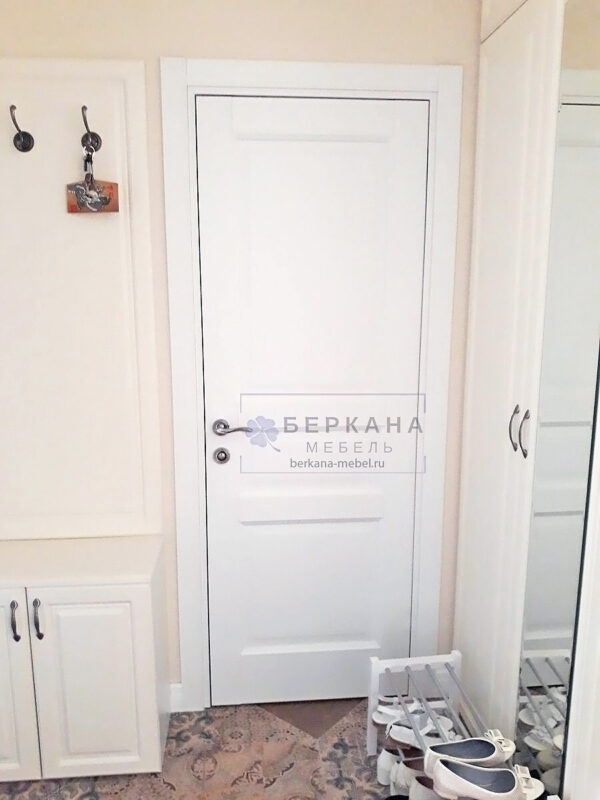 Наша компания разрабатывает и изготавливает и предметы мебели, и межкомнатные двери. Распашная дверь в классическом стиле расположена между шкафом и панелью с крючками.