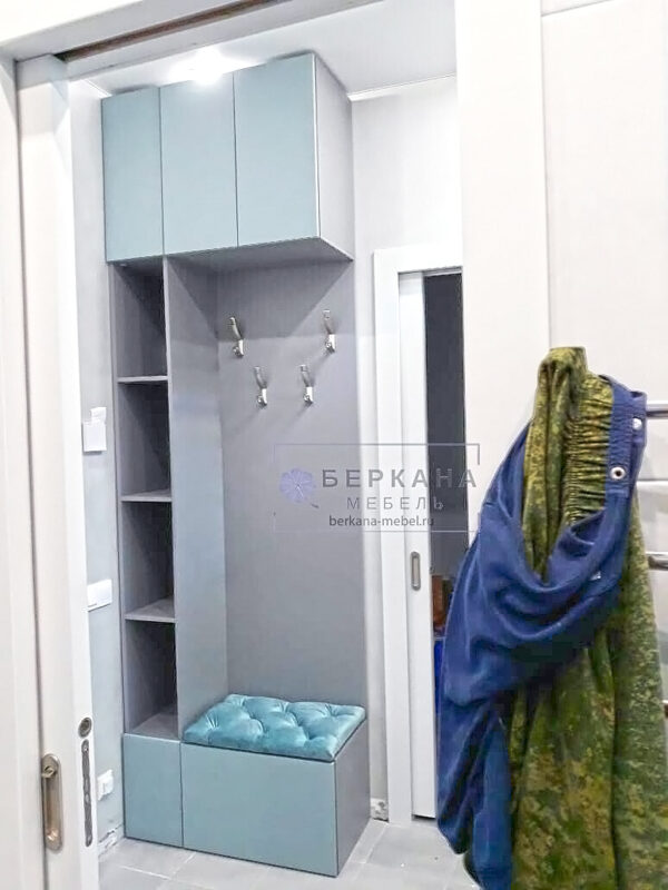 Как правило, в прихожей при входе устанавливают панель с крючками, секцию для обуви. В проекте шкаф до потолка состоит из трех частей.