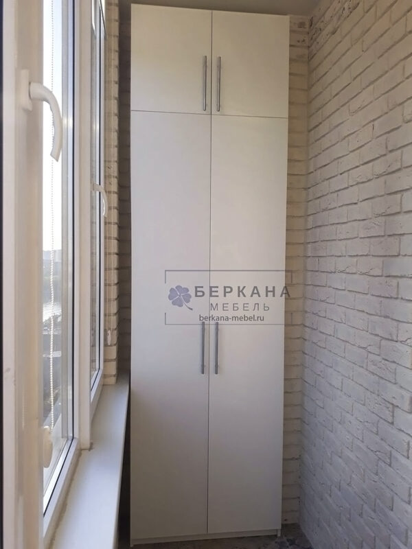 В проекте на балкон изготовлен шкаф с распашными дверьми. Внутреннее пространство планируется с учетом пожеланий заказчика. Секция подходит для хранения спортивного инвентаря. При установке трубки хранится верхняя одежда в чехлах.