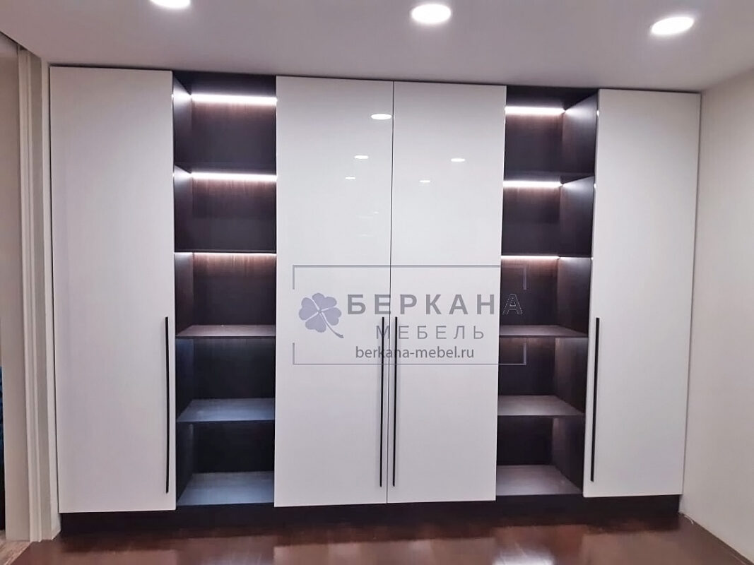 В представленном проекте шкаф с распашными дверьми заменяет одну стену комнаты. Шкаф занимает пространство от пола до потолка.