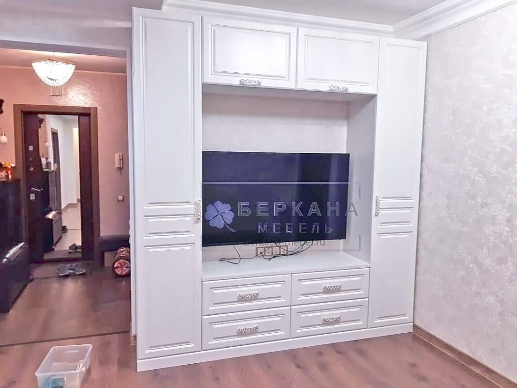 Секции для хранения выстроены по периметру ниши для телевизора. За распашными дверьми – полки.
