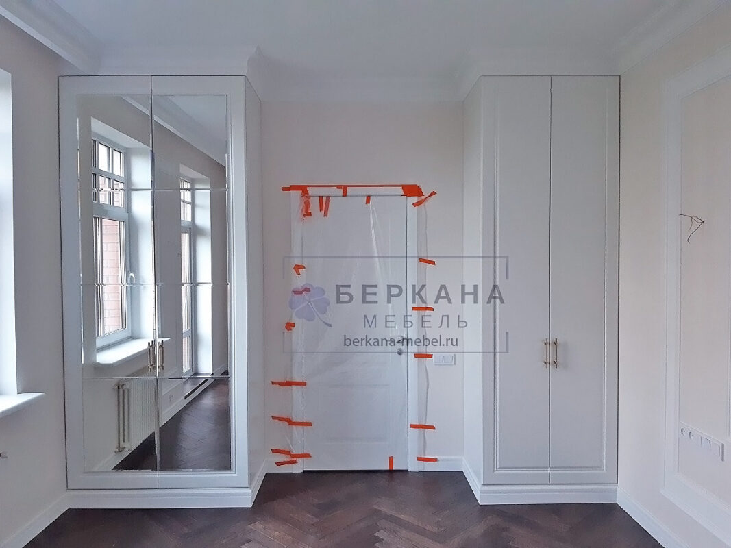 Корпус шкафов – из ЛДСП, фасады из МДФ в эмали. На дверях выполнена декоративная фрезеровка. На двери одного шкафа наклеены зеркала с фацетом.
