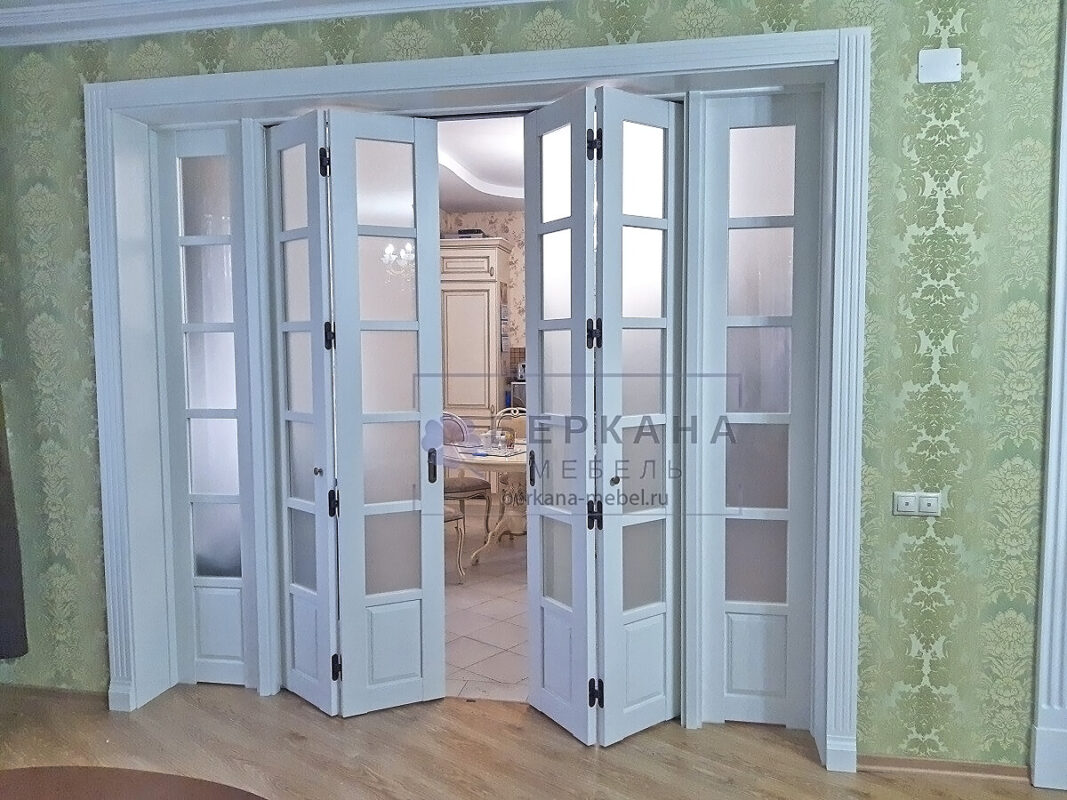 Благодаря разнообразию материалов и технологическим возможностям, межкомнатные перегородки могут стать эффектным элементом интерьером. При этом перегородки выполняют и основную функцию – разделение пространства. В проекте перегородки выполнены в стиле современной классики. Шесть полотен установлены в проеме. Два полотна – стационарные. Между стационарными полотнами – складные двери.
