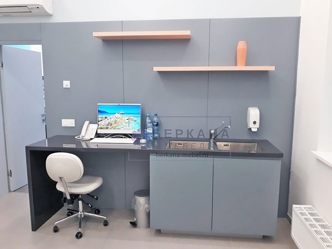 Наша компания проектирует и изготавливает мебель для дома, офисов, школ, медицинских учреждений. По заданию заказчика для медицинского центра в изделии совместили рабочий стол и тумбу с мойкой.