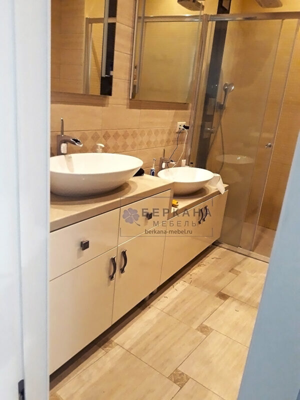 Ванная – помещение с повышенной влажностью. Материалы для мебели выбираются влагостойкие, чтобы исключить разбухание деталей. Для фасадов тумб выбрана МДФ под пластиком.