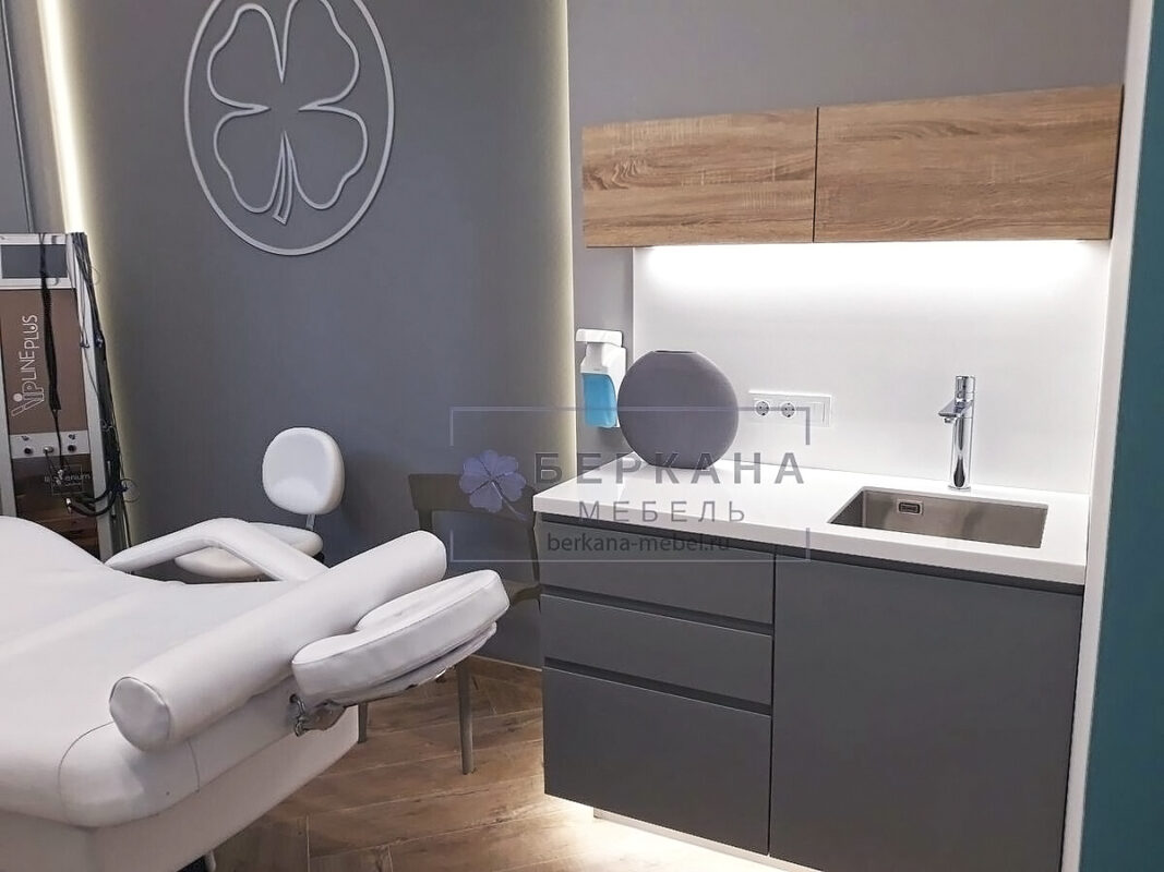 По заказу медицинского центра мы разработали и установили тумбы, рабочие столы, шкафы. Изделия в единой цветовой гамме из практичных материалов. Для столешниц тумбы выбрали искусственный камень.