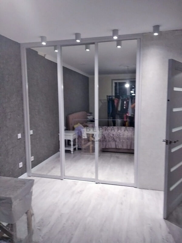 Встроенные конструкции встречаются в каждой второй квартире. При перепланировке ниши предусматривают заранее. Двери шкафов в нишах – продолжение стены помещения. В качестве вставок в двери выбрали зеркало серебро. Три двери имитируют зеркальную стену.